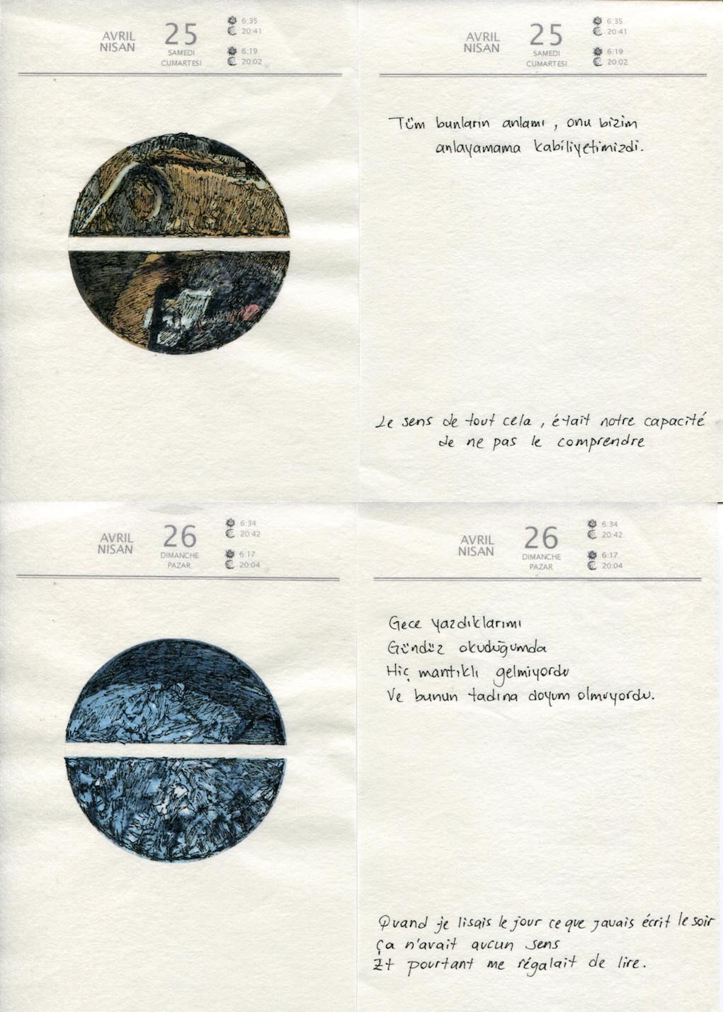 2020, le risque pandémique s’est rappelé à nous et il y eut un premier confinement. Durant 45 jours, du 28 mars au 11 mai 2020, pour mettre à profit ce temps soudain vacant, souvent terne, parfois long, que nous étions tenus de partager, nous élaborâmes un travail en commun. Sous forme d’éphéméride, l’une écrivait, l’autre produisait des images, aucune n’intervenait en illustration des propos de l’autre. Nous créâmes un calendrier où le turc et le français se mêlèrent, et où les heures de lever et de coucher du soleil apparurent dans nos deux villes respectives, Lyon et Çanakkale, Et Thierry Broquet se joignit à nous pour la bande-son.“Ainsi passaient les jours”.
